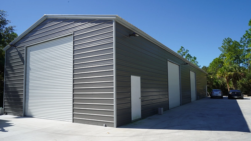 This garage building comes with a vertical roof and three 8’x7′ roll up doors for entry.  Our buildings are designed for your local building codes and can be certified for snow load and wind load requirements in your area. Building prices also include FREE delivery to your job site and FREE installation on your pad. The strength of an Eversafe building is unmatched as it is manufactured using high-quality protective coatings and paint. While the sale prices listed do not include site preparation or concrete work, these optional services are available in many areas.